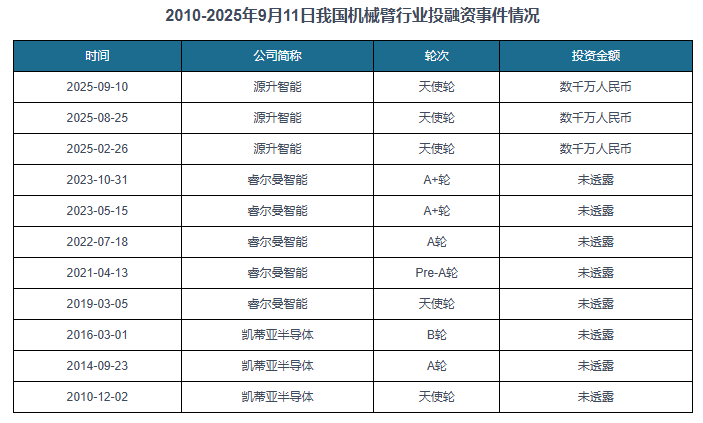 具体来看,我国机械臂行业获得投融资的企业次要有源升智能、睿尔曼智能、凯蒂亚半导体,中逛为机械臂研发和制制;截至2025年9月11日我国机械臂行业生11起投融资事务。2020年到2024年我国机械臂行业市场规模持续增加?凡是由多个驱动关节构成,合作谍报,更辅以大量曲不雅的图表帮帮本行业企业精确把握行业成长态势、市场商灵活向、准确制定企业合作计谋和投资策略。不雅研全国是国内出名的行业消息征询机构,